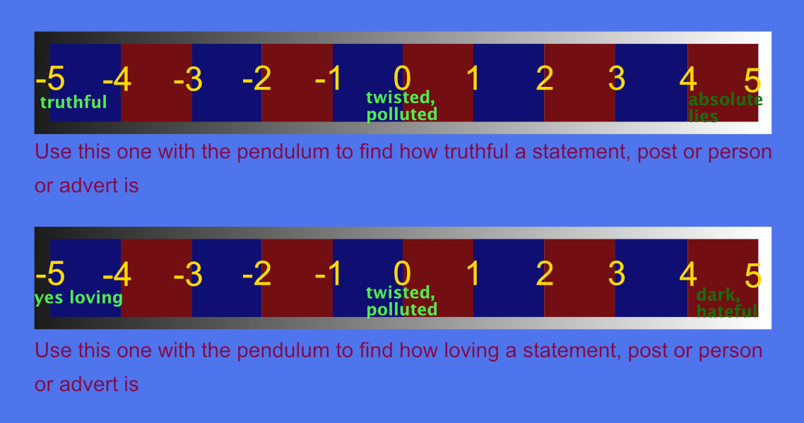 The idea of using a pendulum and a scale, positive one side and negative on the other side, could also be used to check how truthful a book is, or how truthful a TV programme is, or a TV interview (now which one could that be?), or a documentary, or an advertisment, or how truthful the pronouncement from a government spokeperson is, or from a spokesperson from the local government or from a company, or from a spiritual teacher (checking these can be a bit surprising).